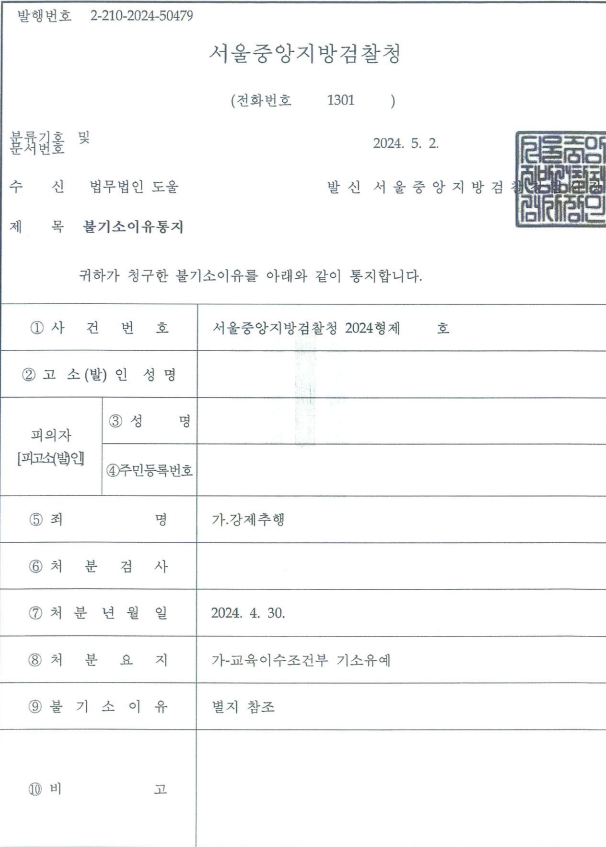 그리고 사건에 이르게 된 경위, 고의 및 행위 인정에 다툼이 있는 사안인 점, 그 밖에 양형적 요소를 최대한 수집하여 논리적인 의견를 제시하며 충실히 변론하였고, 이를 받아들인 검찰에서 '교육조건부 기소유예' 결정을 내리게 되었습니다.