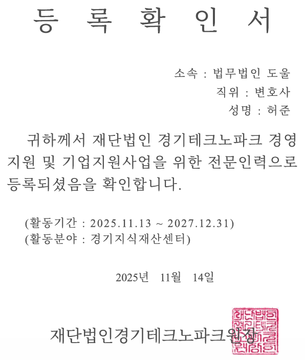 이러한 전문성을 인정받아 최근 경기테크노파크 경영지원 및 기업지원사업을 위한 전문인력으로 등록되었습니다. 향후 경기테크노파크를 통해 경기도 소재 중소기업들의 산업기술, 영업비밀, 기술유출 사건에 대한 상담 및 컨설팅을 지원할 예정입니다.